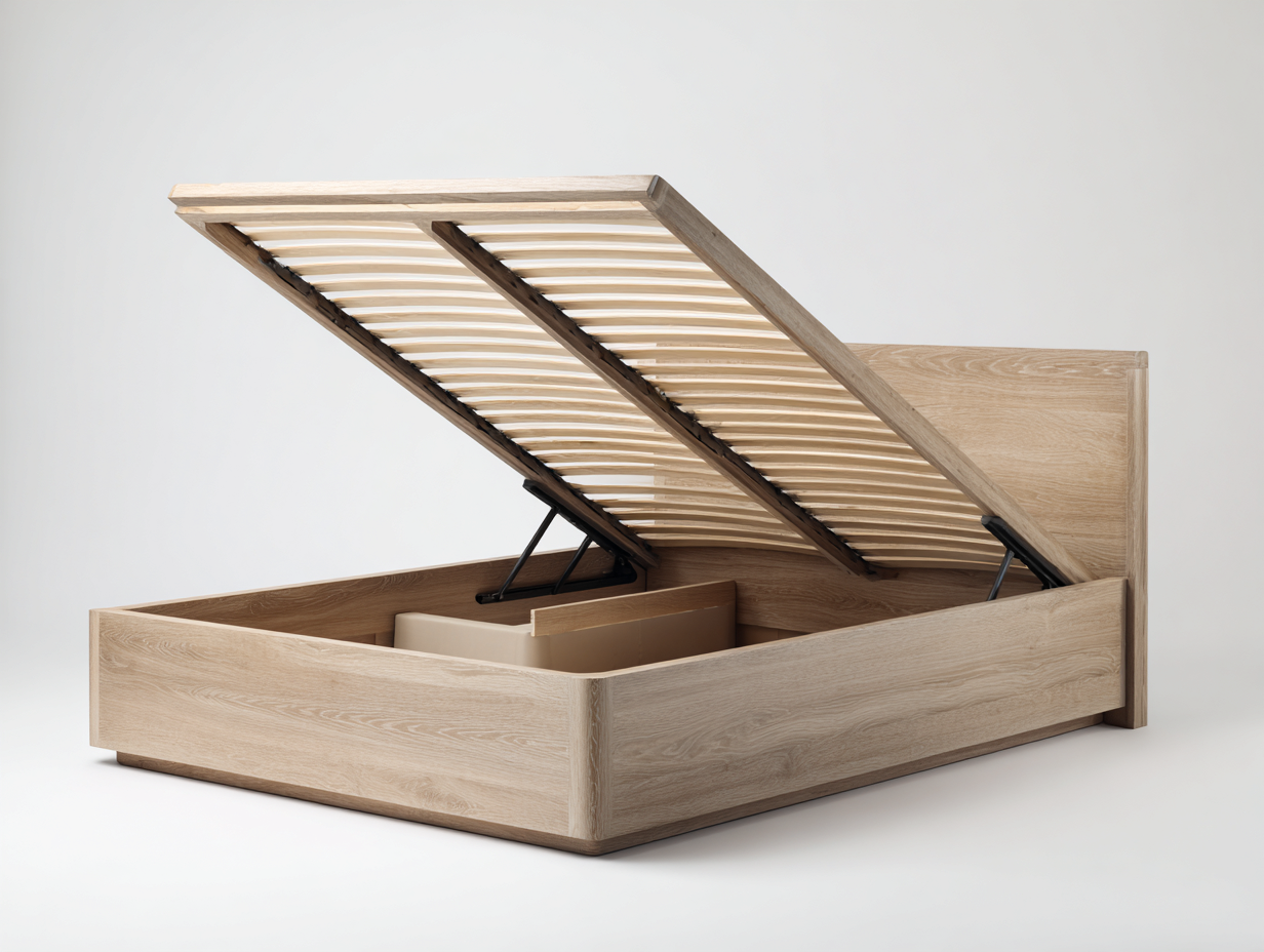 Double Bed wooden storage frame 210x160x90 cm - natural wood - lift-up bedroom design